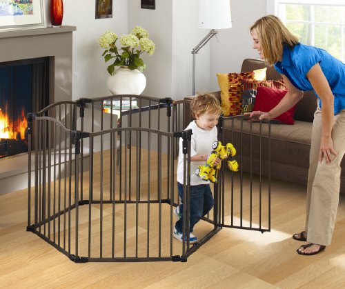 The 3 in 1 Deluxe Bronze Metal Superyard by North States is a multi-purpose extra tall 30" high 6 panel safety enclosure for kids and pets. The Superyard can also be used as an extra wide barrier around fireplaces, steps, or across wide openings. Includes a swinging gate with childproof double locking system.